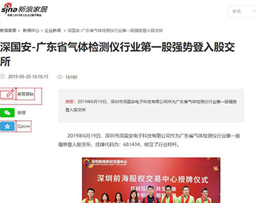2019年6月19日,深圳市深國安電子科技有限公司作為廣東省氣體檢測儀行業強勢登入股交所,掛牌前海股交碼為:681434,樹立了行業標桿。人民日報社、鳳凰網、中華網、中國財經時報網、騰訊網、新浪網、搜狐網、未來網財經、中國安防行業網、慧聰網、北國網、中國應急網、太平洋安防網等眾多媒體進行了報道。